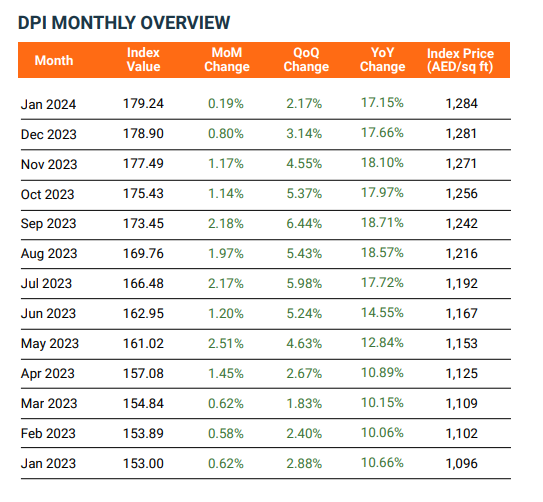 Contrary to the strong annual price growth of 16.4% in 2023, the start of 2024 witnessed a rather unimpressive 0.2% monthly increase in average property prices. The current average price of properties is AED 1,284 per square foot, a modest 4% increase from the peak experienced in September 2014.
