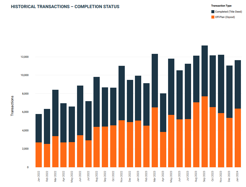 The beginning of 2024 observed remarkable sales transaction volumes totalling 11,615 sales, which marked a 5.4% month-on-month increase. Residential properties, including apartments, townhouses, and villas, constituted 91.7% of these transactions. The luxury property market is booming as we witnessed the sales of properties priced over AED 36.7 million. The leading developer in this category was Omniyat, accounting for over 26% of the sales. This surge is primarily due to the addition of 6,413 off-plan Oqood transactions, an 18.8% month-on-month increase. Meanwhile, Title Deed sale volumes are witnessing a 7.4% decrease.