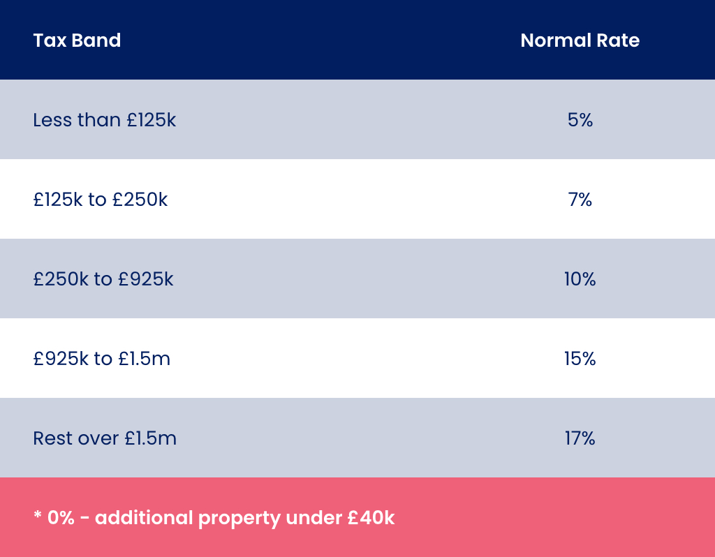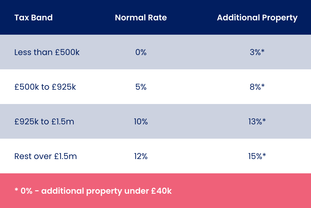5. A surcharge of 3% is included for additional property purchases, including second homes, and buy to let investments. However, if the additional property is purchased for less than £40k, the SDLT rate will be 0%. The SDLT rate for all purchases from £40k to £500k is 3% charged on the full purchase price.