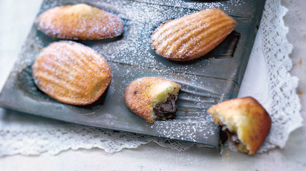 8. Add a dollop of hazelnut spread to each madeleine and top with the remaining mixture until full