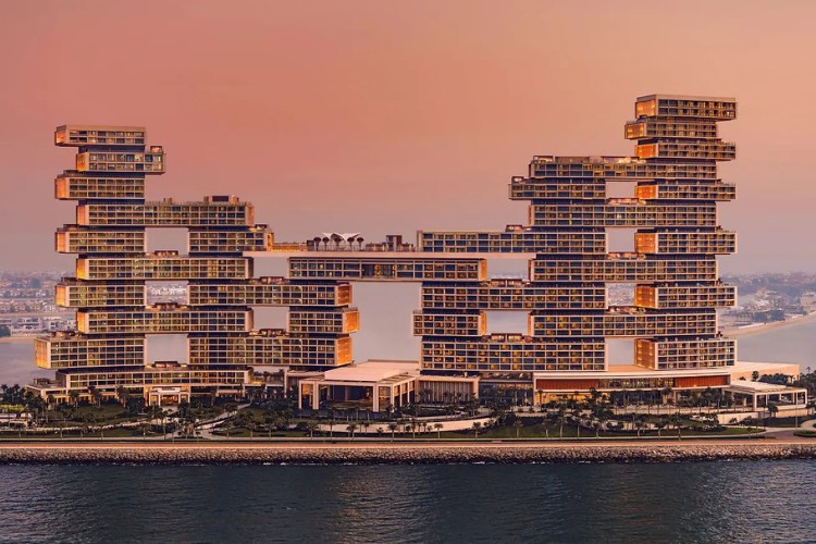 The Atlantis was the first hotel to be built on the world-famous Palm Jumeirah. Themed on the myth of Atlantis, this iconic hotel incorporates elements of Arabian and oceanic design. The resort is characterised by its striking pink hue, extensive use of glass facades, and intricate detailing. The overall structure is grand and awe-inspiring, resembling the legendary lost city of Atlantis. One of the most distinctive features of Atlantis is its focus on water-related attractions, including Aquaventure, one of the world's largest waterparks, The Lost Chambers Aquarium and its luxurious underwater hotel rooms.