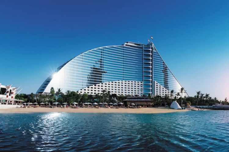Jumeirah Beach Hotel is one of Dubai's first luxury hotels and undoubtedly one of its most famous. The hotel's structure is designed to resemble a breaking wave, with a curving façade that creates an illusion of movement. This unique architecture stands out along the coastline, making it a prominent landmark in Dubai.